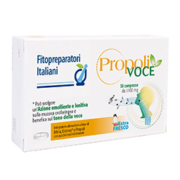 Propoli VOCE è un integratore alimentare a base di Mirra, Erisimo e Propoli. La Mirra risulta utile per la funzionalità della mucosa orofaringea, mentre l’Erisimo svolge un’azione emolliente e lenitiva sulla mucosa orofaringea e sul tono della voce