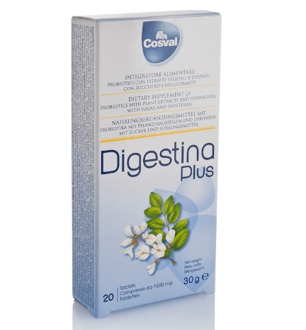 Digestina Plus è un integratore alimentare di probiotici ( L. salivarius, L. acidophilus, L. casei, B. coagulans e S. thermophilus) con estratti vegetali di Ananas, Carciofo, Finocchio, Papaia, Genziana e Frangola, e derivati, che favorisce la funzione digestiva e l'equilibrio della flora intestinale.