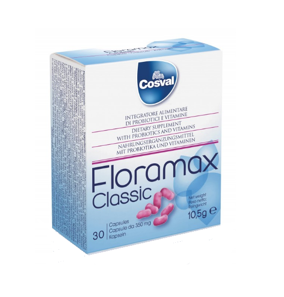 Floramax Classic è un integratore di Probiotici (L. casei, L. acidophilus e B. coagulans) con vitamine (Vit. B1, B2, B6) che possono favorire l'equilibrio della flora intestinale. L’intestino e la flora intestinale sono fondamentali per la salute dell’intero organismo. Un intestino sano e una flora intestinale bilanciata sono responsabili della corretta digestione dei cibi, dell’assorbimento dei nutrienti, della sintesi di alcune vitamine e supportano le difese immunitarie, in larga parte presenti nell’intestino. Cambi di stagione o di alimentazione, assunzione di farmaci, sono tutti fattori che inducono la necessità di assumere i fermenti lattici, i nostri alleati per il ripristino e il mantenimento della salute. L. Acidophilus SGL11 contribuisce a ripristinare l’equilibrio della flora intestinale (disbiosi); L. Casei SGL15 è un batterio appartenente alla famiglia delle Lactobacillaceae, un probiotico presente nel microbiota (microorganismi simbiontici che convivono con l’organismo umano senza danneggiarlo). B. Coagulans SGBc01 (Lactobacillus Sporogenes) è un probiotico, microrganismi che sono in grado, una volta ingeriti in adeguate quantità, di arrivare vivi e attivi nell’intestino, si presenta in forma di “spora attiva” e ciò gli conferisce stabilità alla temperatura e all’acidità dello stomaco e solo una volta giunto nell’intestino germina rapidamente andando ad incrementare la flora batterica. St. thermophilus SGSt 01, a differenza del maggior numero degli altri batteri, è un microrganismo utile all’organismo stimola la regolarità della flora intestinale.
