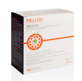 Migliorin Gellule è un integratore alimentare con L-Cistina e Acido Pantotenico. Il preparato in gellule è utile per nutrire i capelli e, al tempo stesso, rinforzare le unghie. A base di Aminoacidi solforati, Vitamina E, Equiseto, Cheratina, Pantotenato di Calcio contenente Vitamina B, Estratto di Miglio dorato* e Olio di germe di Grano, agisce dall’interno, proteggendo i capelli, favorendone il naturale processo di crescita, rafforzando le radici, migliorando l’ossigenazione del cuoio capelluto.