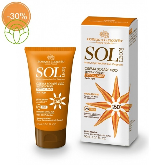 La Crema solare Viso SPF50 ad altissima protezione è una morbida crema con fattore potenziato di protezione per contrastare i segni visibili dell'invecchiamento cutaneo dovuti all'esposizione solare e prevenire arrossamenti ed eritemi. La formulazione è studiata per dare la massimo contrasto ai fattori di invecchiamento cutaneo. Cere di Jojoba, Girasole e Mimosa in sinergia con Estratti di Tè Verde, antiossidanti, agiscono per la protezione della delicata pelle del viso, mentre Aloe vera, Burro di Karité, Olio di Carota e Bisabololo Camomilla continuano l'azione nutriente, protettiva e restitutiva della pelle. Las crema solare viso antiage contiene filtri solari UVA-UVB che garantiscono dai rischi da esposizione ai raggi dannosi del sole ed evitano arrossamenti, macchie solari ed eritemi. La texture fluida e non grassa si assorbe in pochi istanti senza lasciare traccia, è facile da applicare in modo uniforme e duraturo così da garantire una efficace protezione al sole.